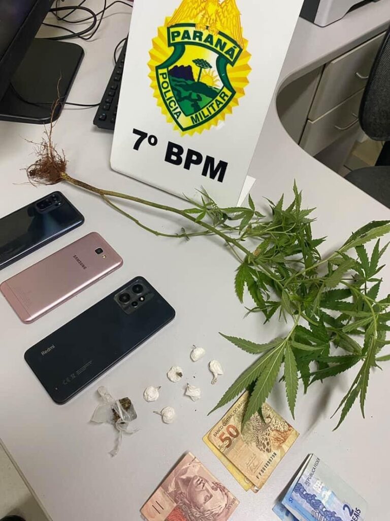 Com a autorização da responsável pelo imóvel próximo ao local da abordagem, os policiais realizaram buscas na residência, onde encontraram mais entorpecentes, uma planta de maconha, dinheiro trocado, aparelhos celulares e outro indivíduo no interior do imóvel.
