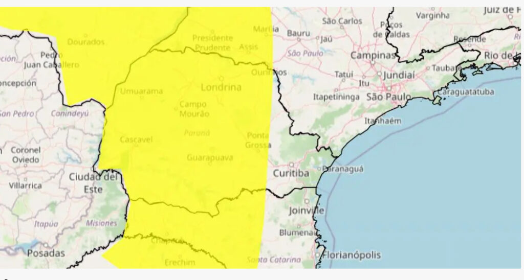 O alerta abrange cidades como Maringá, Cianorte, Umuarama, Londrina, Cascavel, Toledo, Pato Branco, Guarapuava, Campo Mourão, Apucarana e Foz do Iguaçu, entre outras.