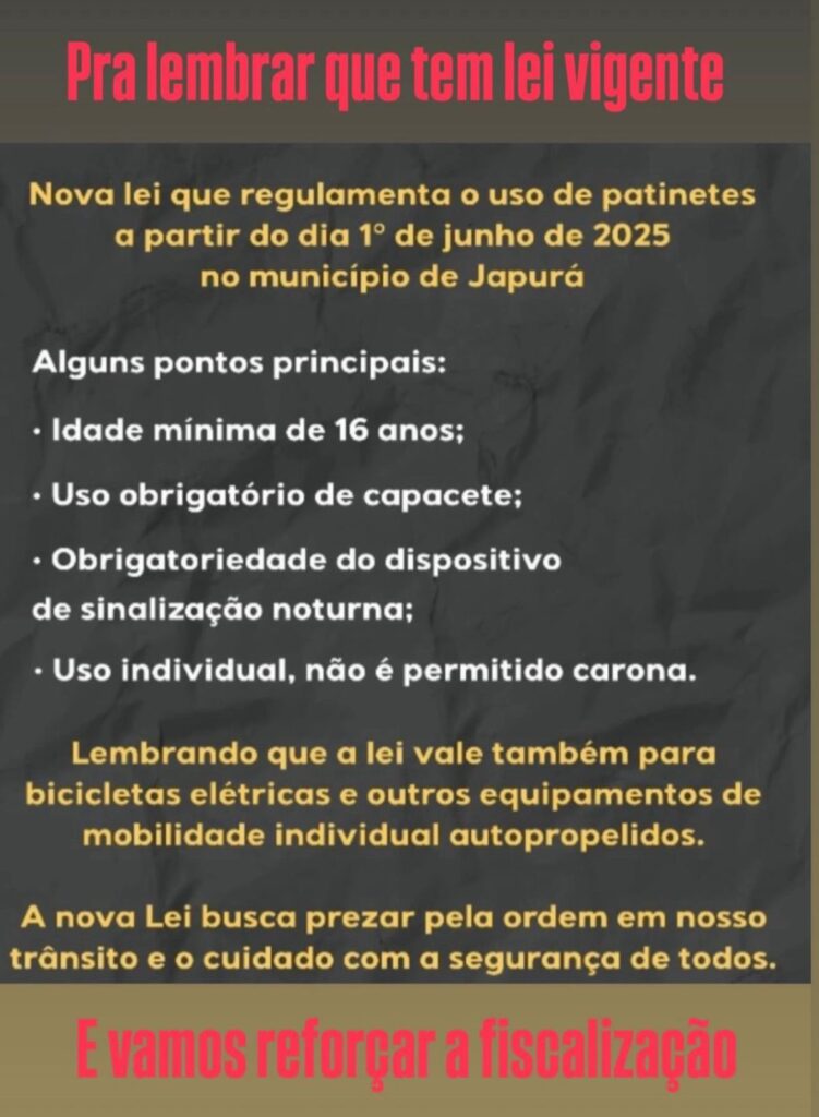 A partir do dia 1º de junho de 2025, os moradores de Japurá deverão seguir novas regras para o uso de patinetes, bicicletas elétricas e outros equipamentos de mobilidade individual autopropelidos no município. A legislação, recentemente sancionada, tem como objetivo garantir mais segurança no trânsito e organizar a circulação desses veículos na cidade.