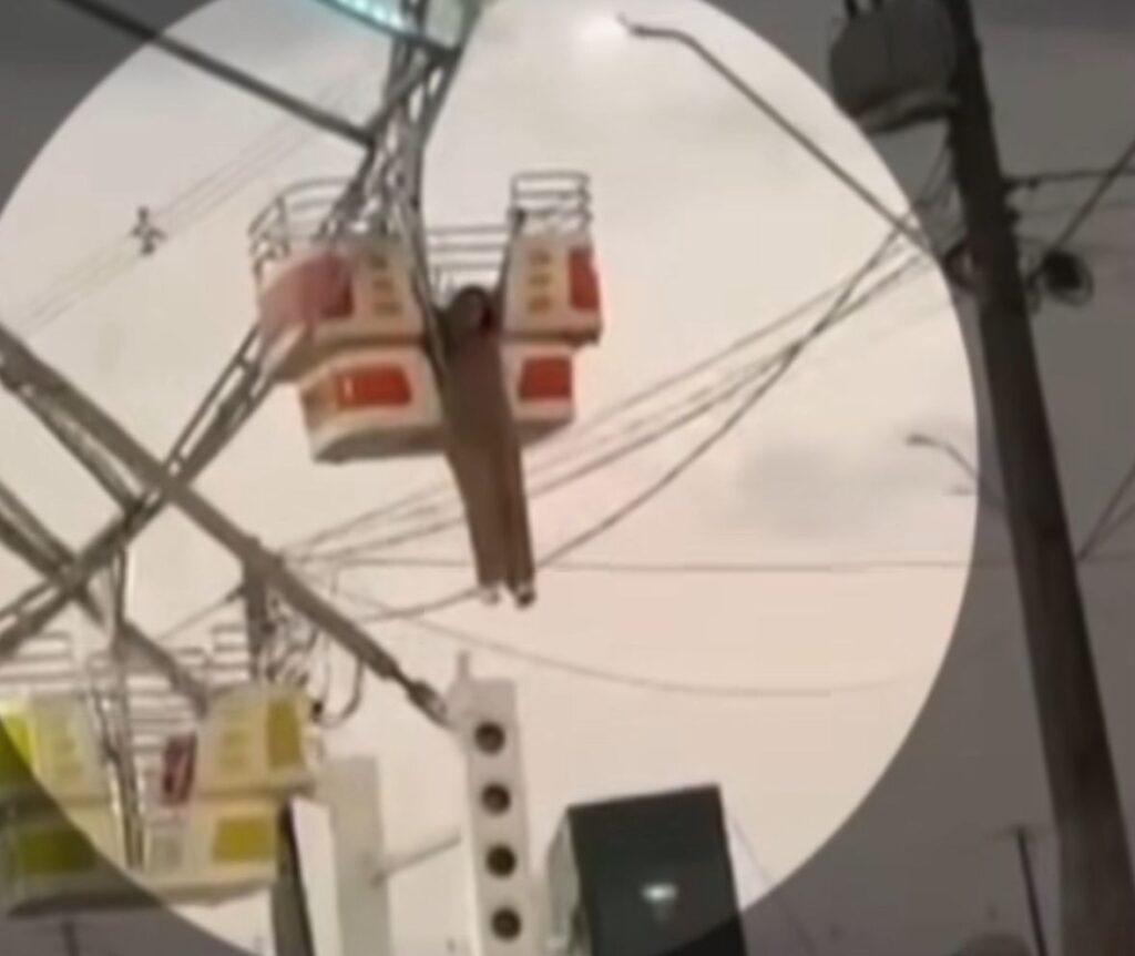 Apesar do susto, ninguém se feriu. Imagens que circulam nas redes sociais mostram a mulher sendo resgatada com apoio de populares e da equipe responsável pelo brinquedo.