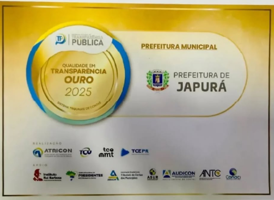 A Prefeitura de Japurá foi reconhecida com o Selo Ouro em Qualidade em Transparência Pública 2025, certificação concedida no âmbito do sistema dos Tribunais de Contas do Brasil. O selo atesta o alto nível de transparência na gestão pública municipal, especialmente no que se refere ao acesso às informações, prestação de contas e cumprimento das normas de transparência fiscal.