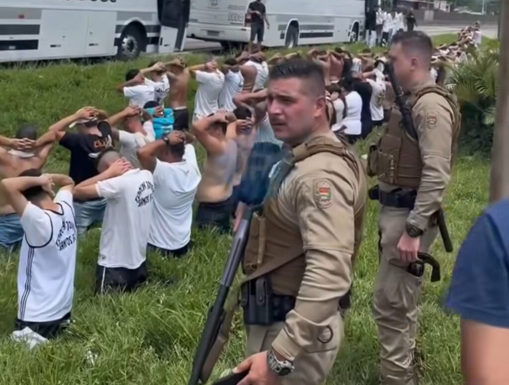 De acordo com informações de autoridades locais, o helicóptero da Polícia Militar de Santa Catarina também foi mobilizado devido a suspeitas de que alguns participantes estariam armados, o que elevou o protocolo de segurança da operação.